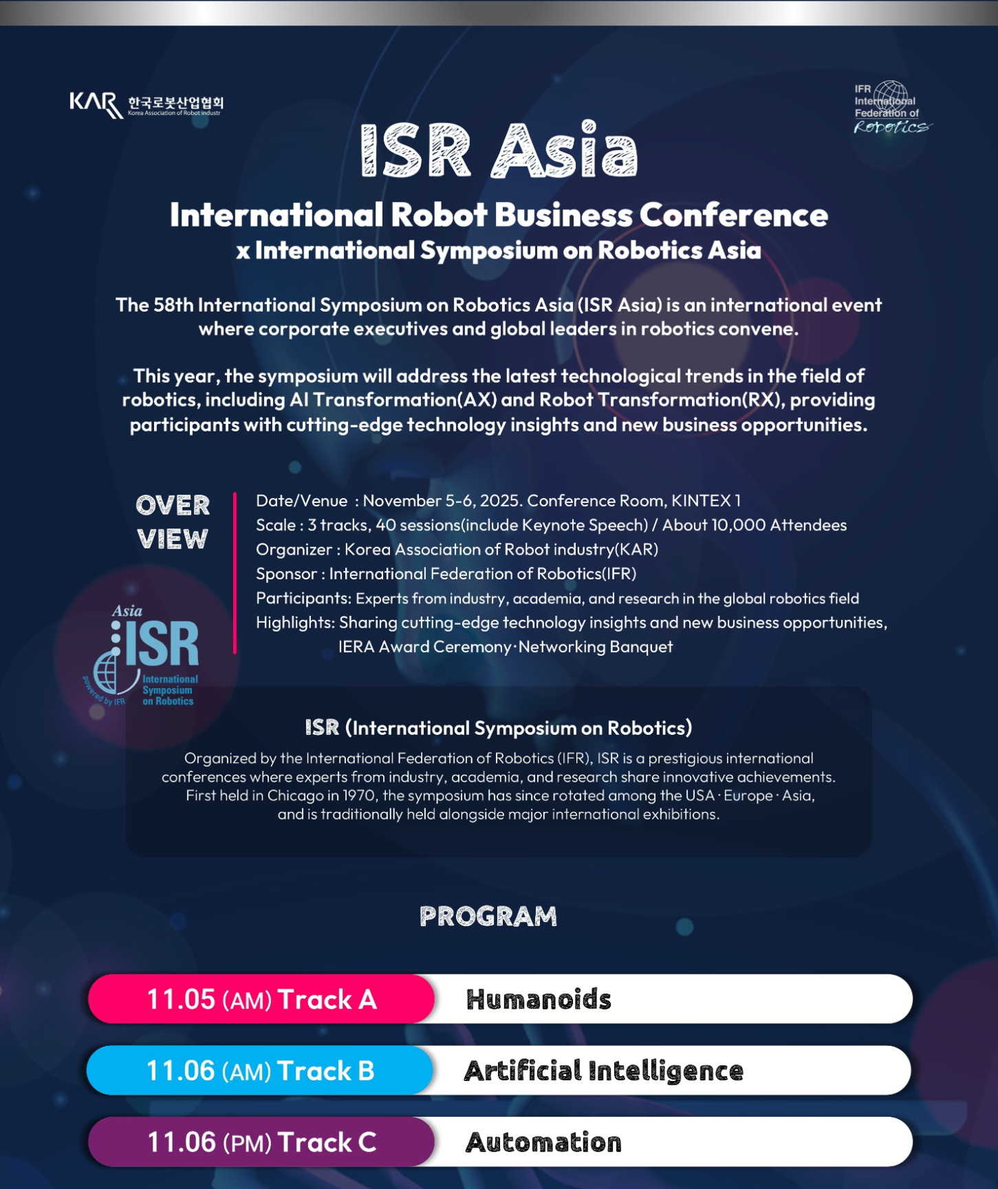 The 58th International Symposium on Robotics (ISR 2025) will be held on November 5~6, 2025 at Goyang,