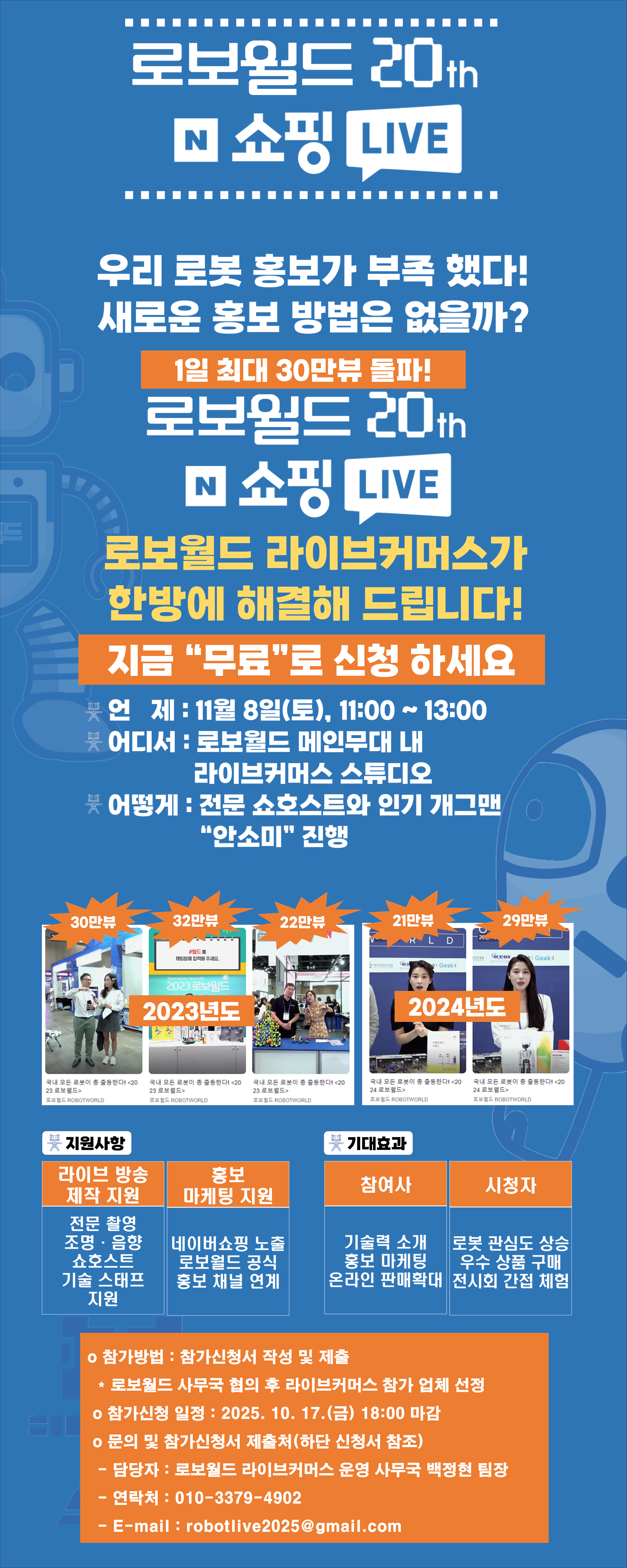 6. 문의 : 로보월드 라이브커머스 운영 사무국 백정현 팀장(010-3379-4902 / robotlive2025@gmail.com)
