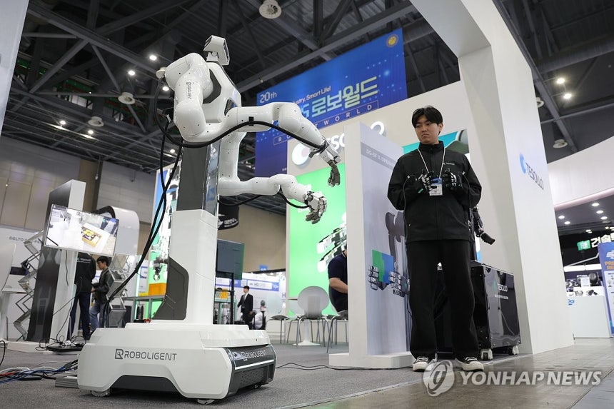 (고양=연합뉴스) 임병식 기자 = 5일 경기도 고양시 킨텍스에서 열린 2025 로보월드에서 휴머노이드 로봇이 사용자의 손동작과 동일한 움직임을 시연하고 있다. 2025.11.5 andphotodo@yna.co.kr