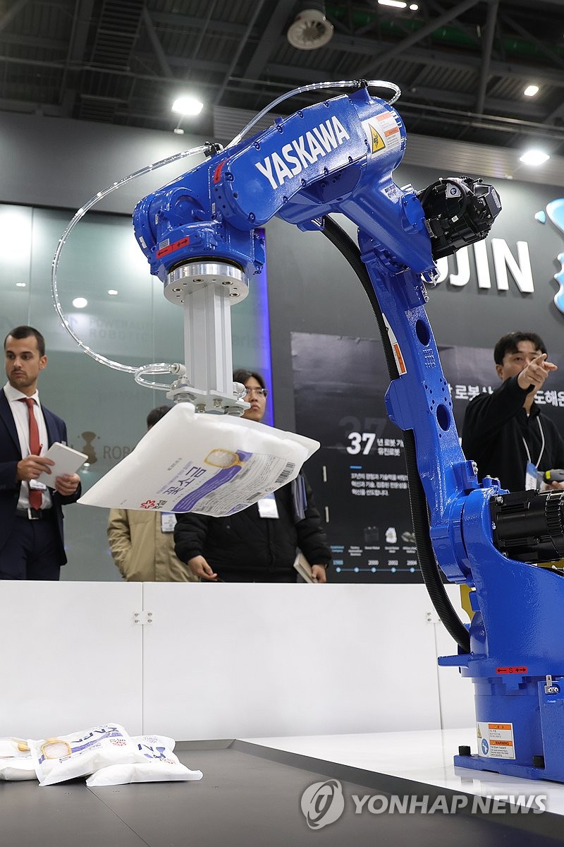 (고양=연합뉴스) 임병식 기자 = 5일 경기도 고양시 킨텍스에서 열린 2025 로보월드에서 인공지능(AI) 로봇이 물건을 집어 올리고 있다. 2025.11.5 andphotodo@yna.co.kr